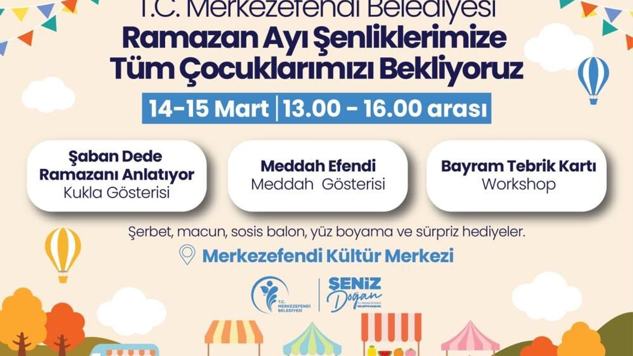Merkezefendi Belediyesi, Ramazan ayının birlik, beraberlik ve paylaşma ruhunu çocuklara yaşatmak amacıyla Ramazan Şenliği düzenliyor. 14 ve 15 Mart tarihlerinde Merkezefendi Kültür Merkezi’nde gerçekleştirilecek şenlik, 13.00 ile 16.00 saatleri arasında çocukları eğlenceli ve öğretici etkinliklerle buluşturacak. Şenlikte çocuklar geleneksel Ramazan kültürünü yakından tanıyacak. Programda yer alan "Şaban Dede Ramazanı Anlatıyor" kukla gösterisi ile çocuklara Ramazan ayının anlamı eğlenceli bir dille aktarılacak. "Meddah Efendi" gösterisi ile de geleneksel meddah anlatıları sahneye taşınarak çocuklara keyifli bir hikâye deneyimi sunulacak.